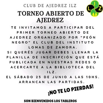Torneo de ajedrez en el INSTITUTO LOMAS DE ZAMORA. A inscribirse! Sábado 25 de juniojunio 11, 2022 Avenioda Meeks 654, Temperley
